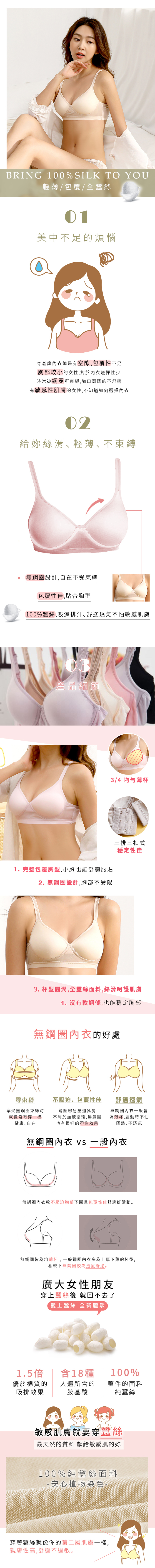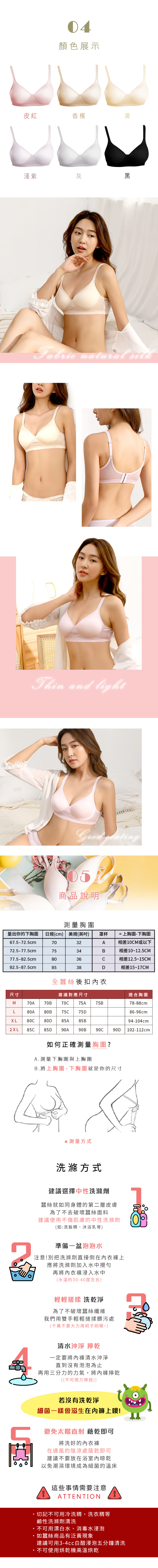 100%全蠶絲面料更親膚,後扣式讓下圍更有伸縮範圍,肩帶可以調節,杯型立體,瘦的人也不太會空杯