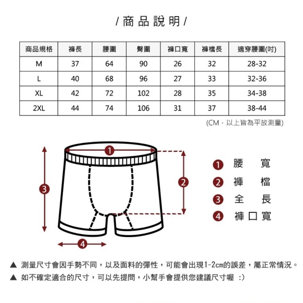 M:腰圍 64 褲口 52 褲長 37 臀圍 90 (CM) ,建議腰圍28-32吋