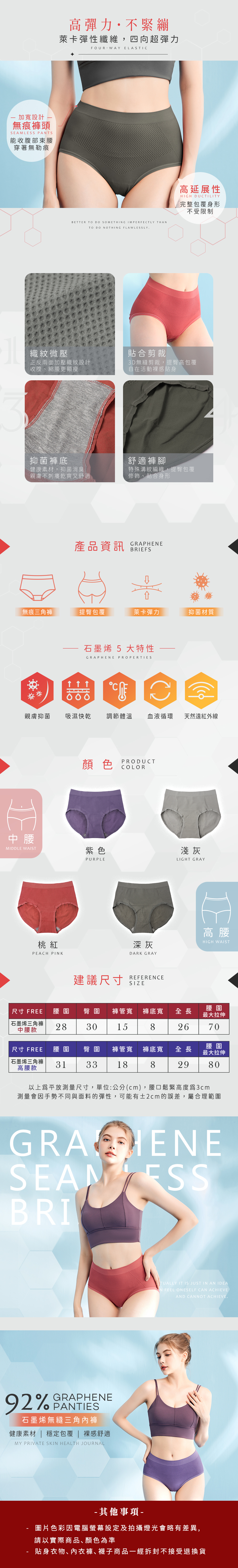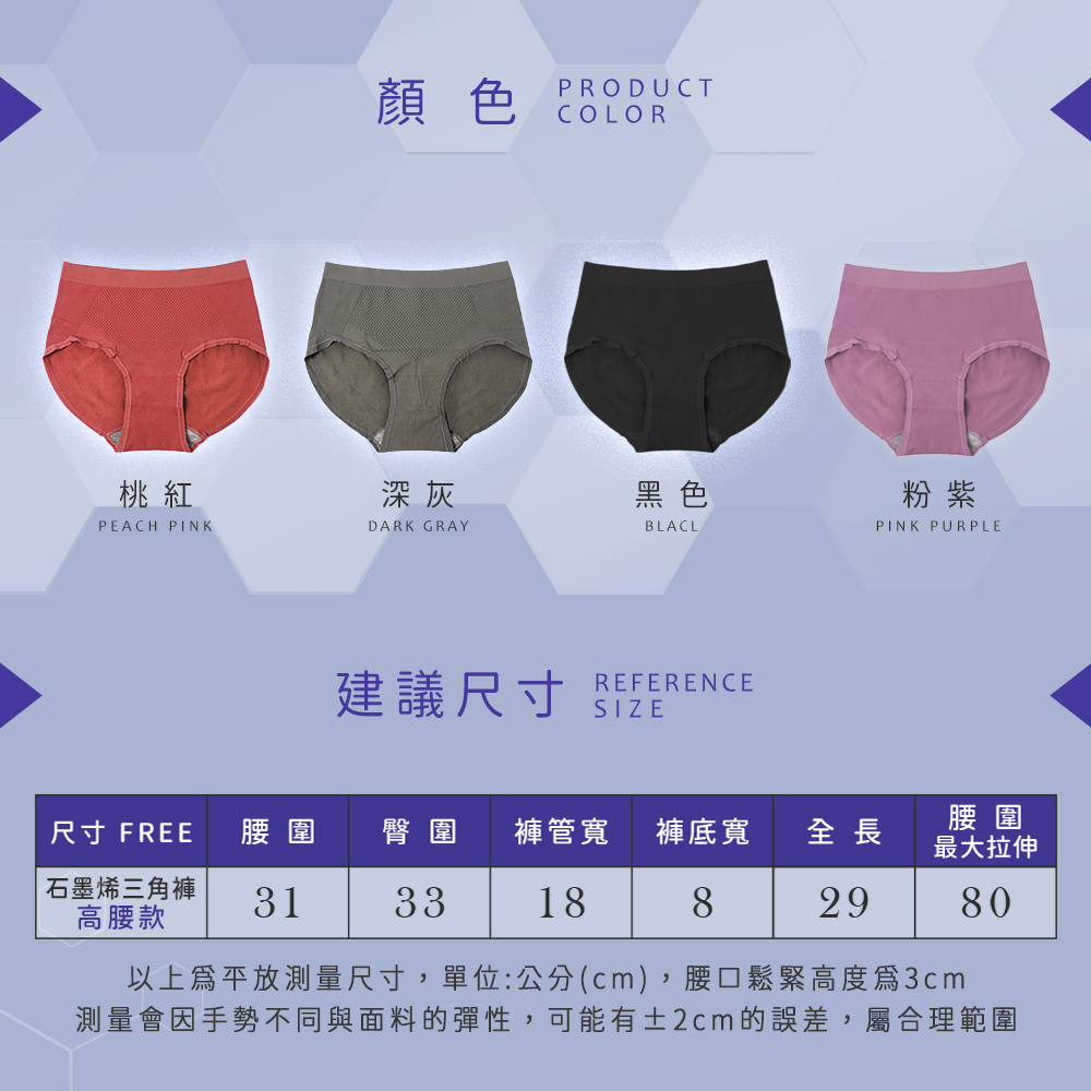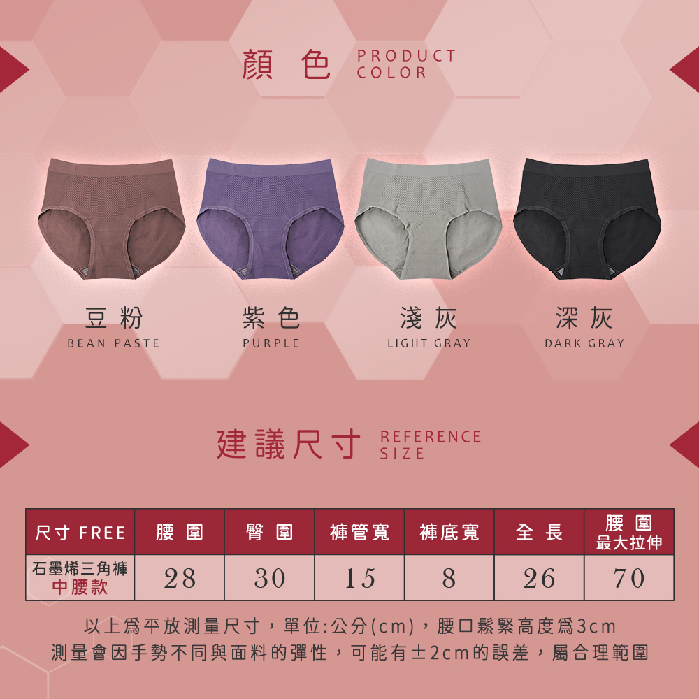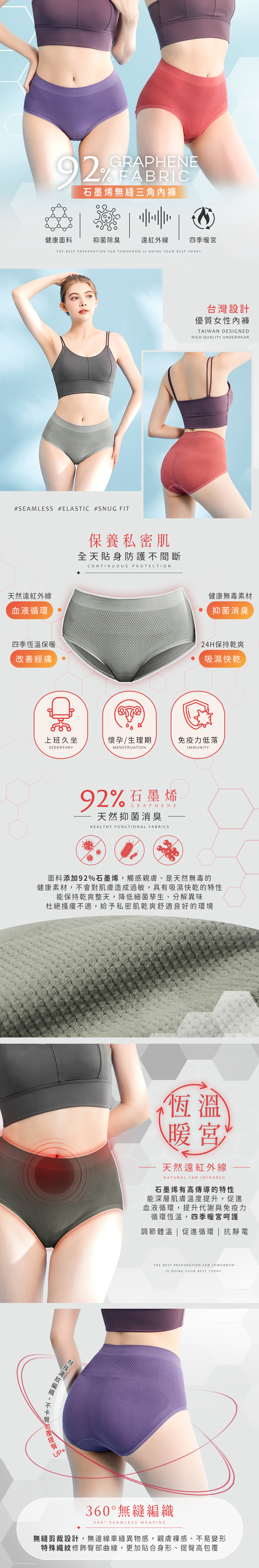 添加石墨烯舒緩肌肉緊繃,改善血液循環,天然無毒、無刺激性的面料,不會對肌膚造成過敏,抗菌消臭、吸濕快乾,保持乾爽一整天,改善私密處衛生健康。